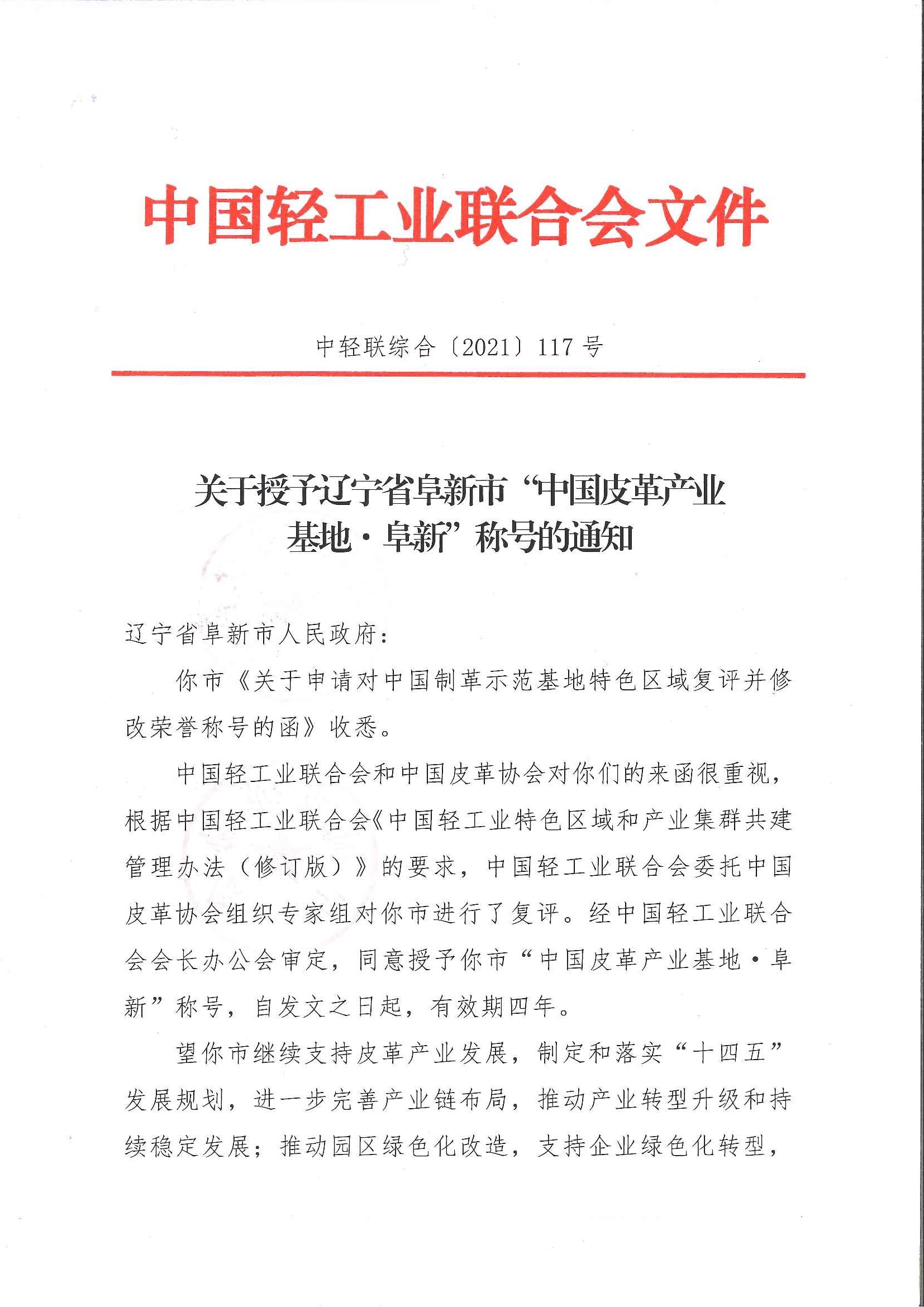 关于授予辽宁省阜新市“中国皮革产业基地·阜新”称号的通知