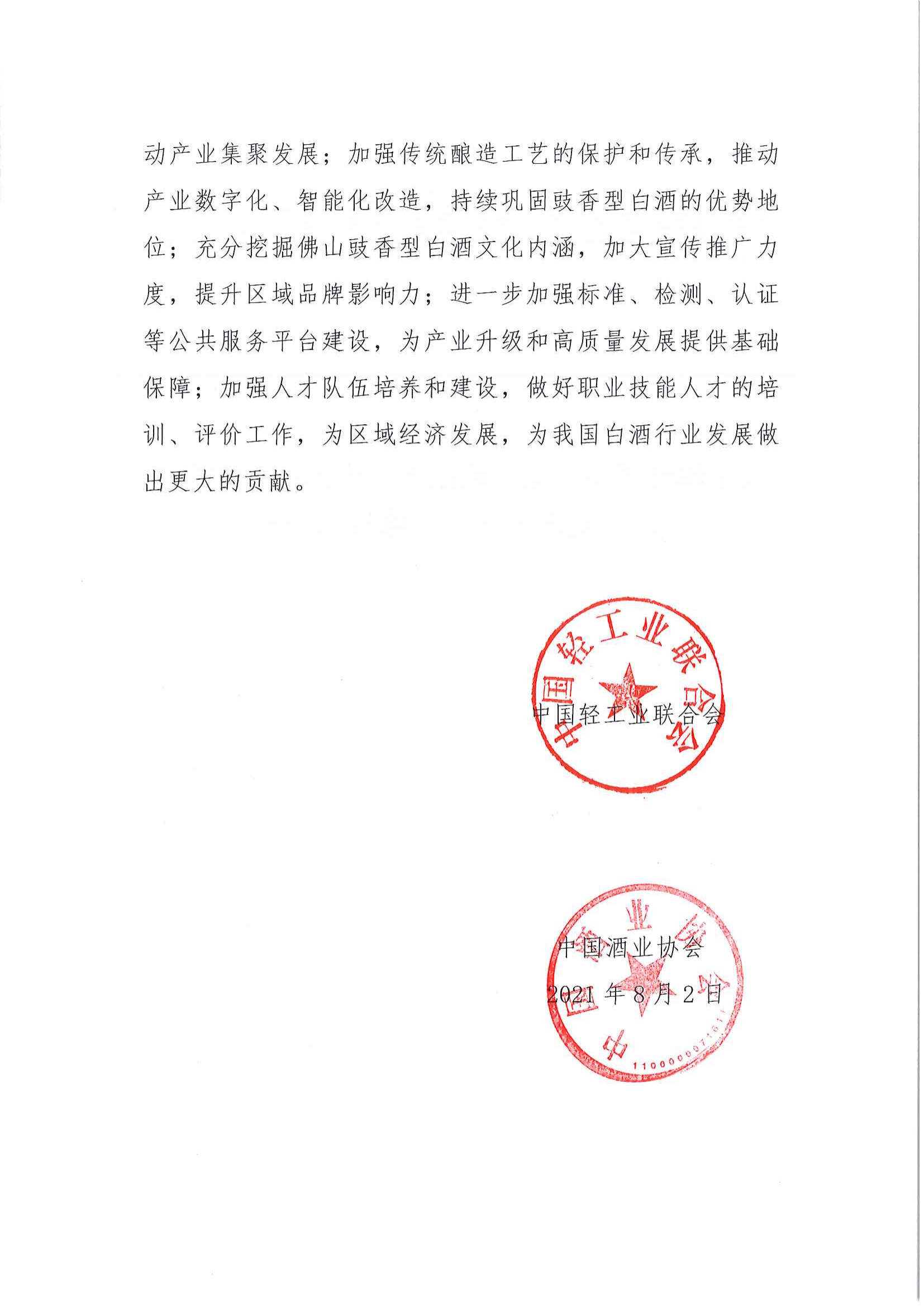 关于继续授予广东省佛山市“中国豉香型白酒产业基地·佛山”称号的通知