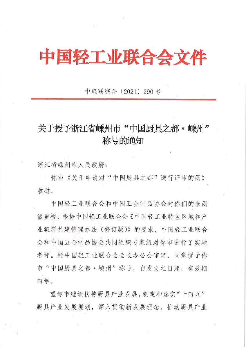关于授予浙江省嵊州市“中国厨具之都·嵊州”称号的通知