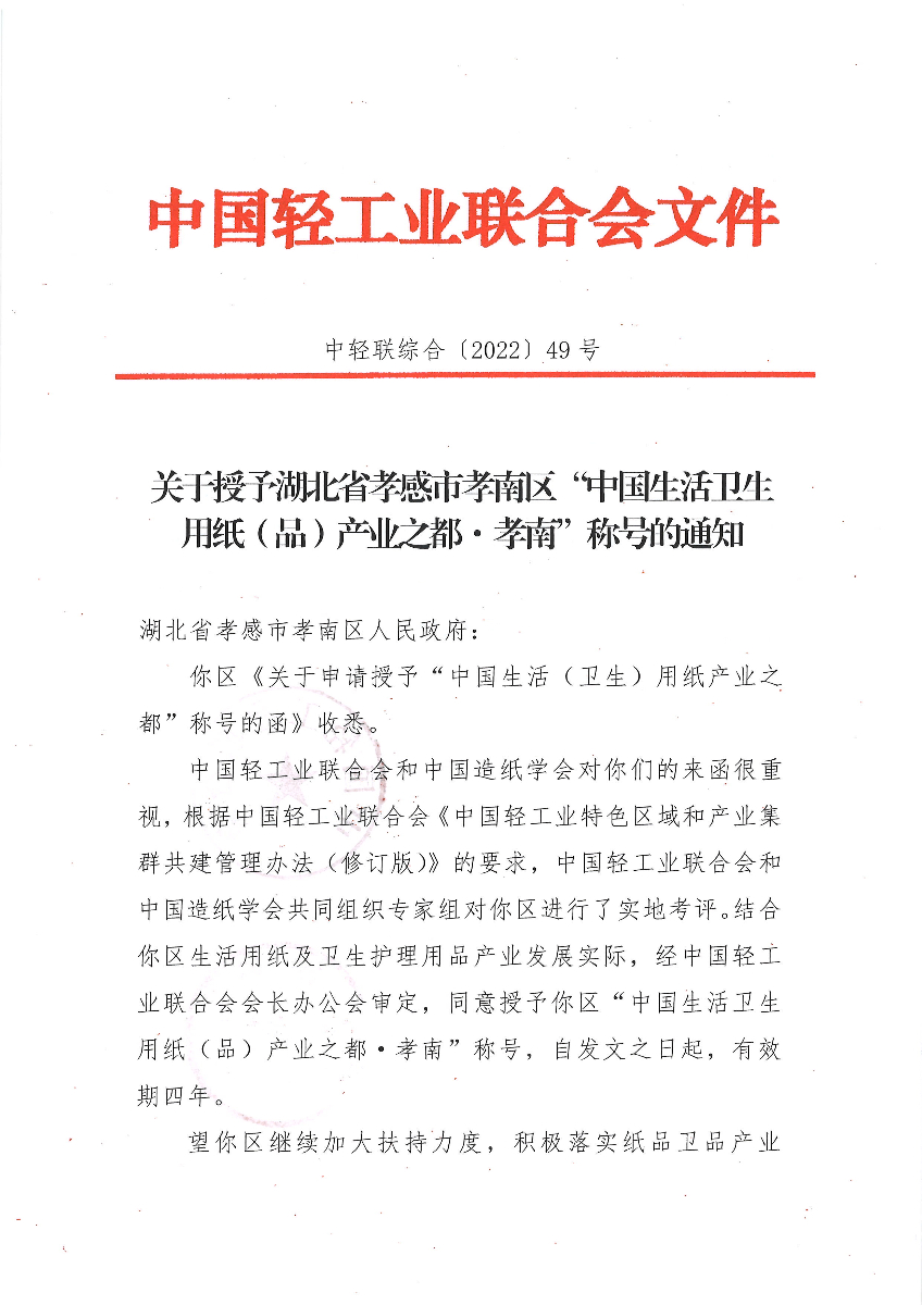 关于授予湖北省孝感市孝南区“中国生活卫生用纸(品)产业之都·孝南”称号的通知