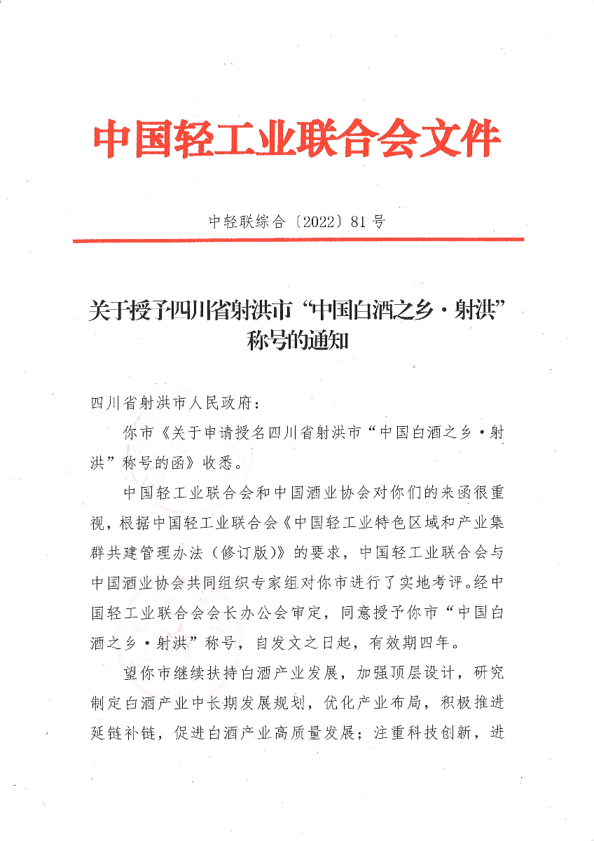 关于授予四川省射洪市“中国白酒之乡·射洪”称号的通知