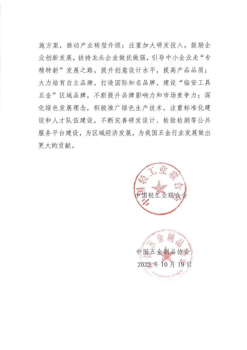 关于授予浙江省杭州市临安区“中国工具五金生产基地·临安”称号的通知
