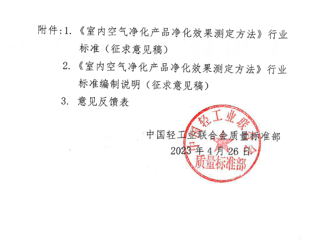 关于征求《室内空气净化产品净化效果测定方法》行业标准(征求意见稿)意见的函