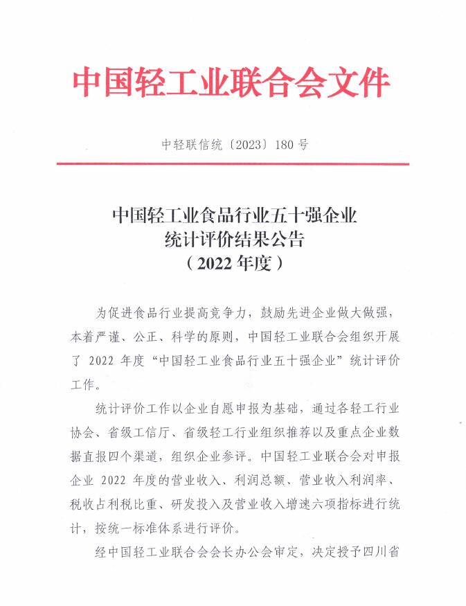 中国轻工业食品行业五十强企业统计评价结果公告(2022年度)