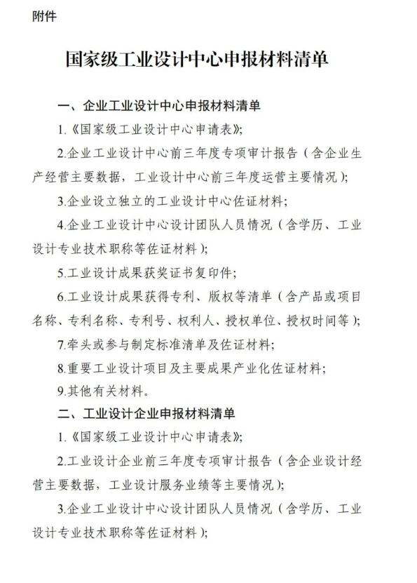 (一)开展国家级工业设计中心认定及复核工作是引导工业设计创新发展、提升制造业设计能力的重要措施。请各省级主管部门高度重视,严格按照基本条件、推荐数量、时间节点等要求,做好申报推荐、复核相关工作。