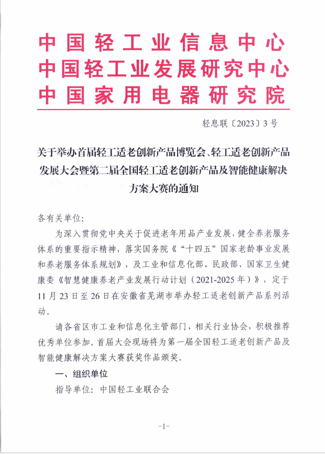关于举办首届轻工适老创新产品博览会、轻工适老创新产品发展大会暨第二届全国轻工适老创新产品及智能健康解决方案大赛的通知