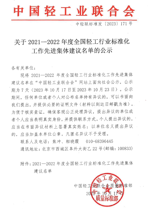 关于2021—2022年度全国 标准化工作先进集体建议名单的公示