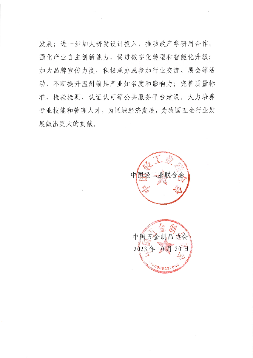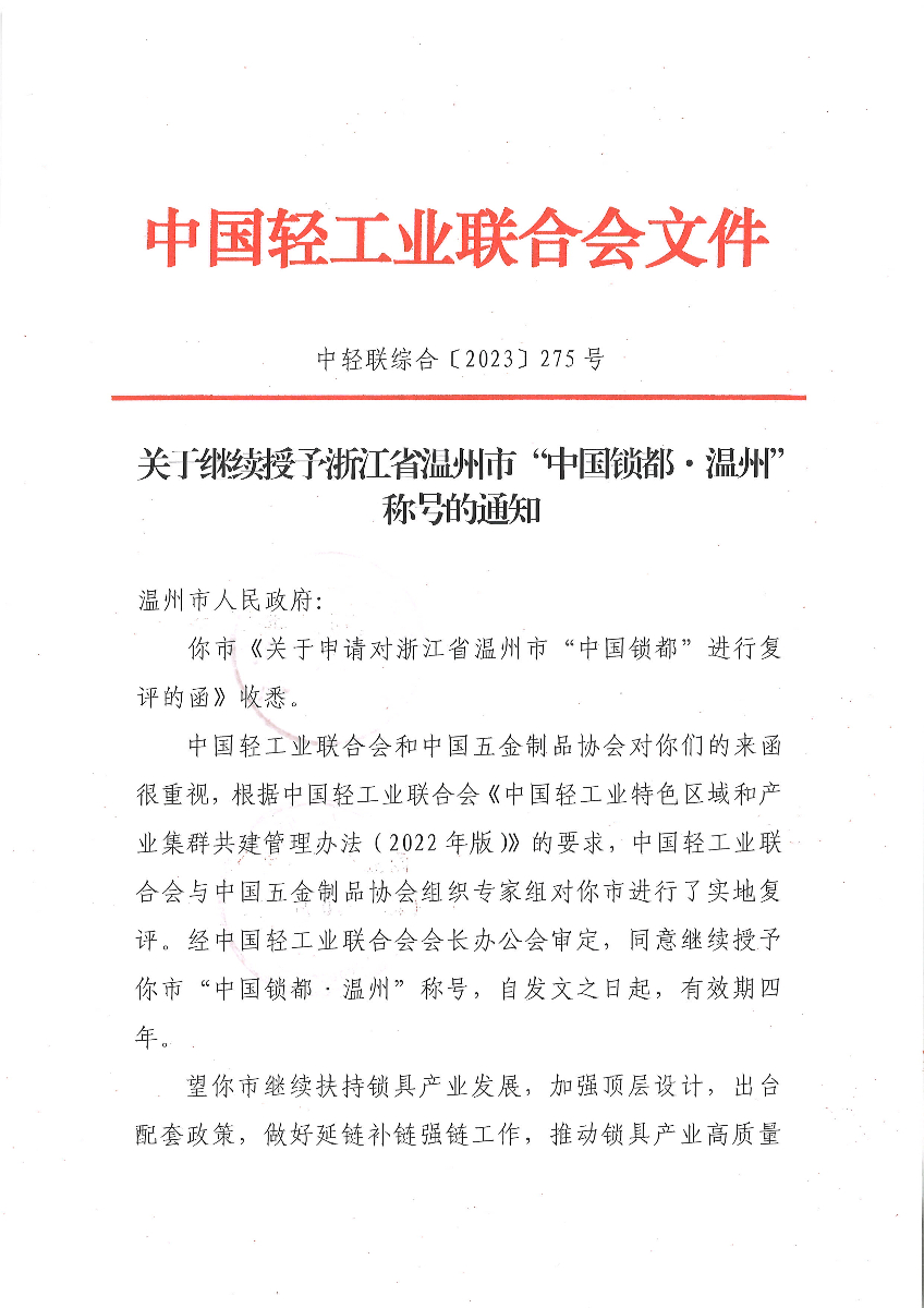 关于继续授予浙江省温州市“中国锁都·温州”称号的通知