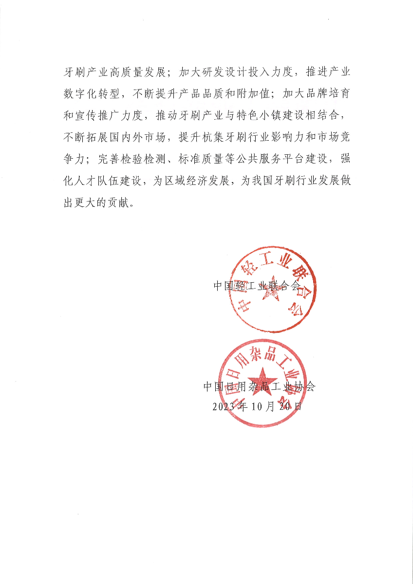 关于继续授予江苏省扬州市生态科技新城杭集高新区“中国牙刷之都·杭集”称号的通知