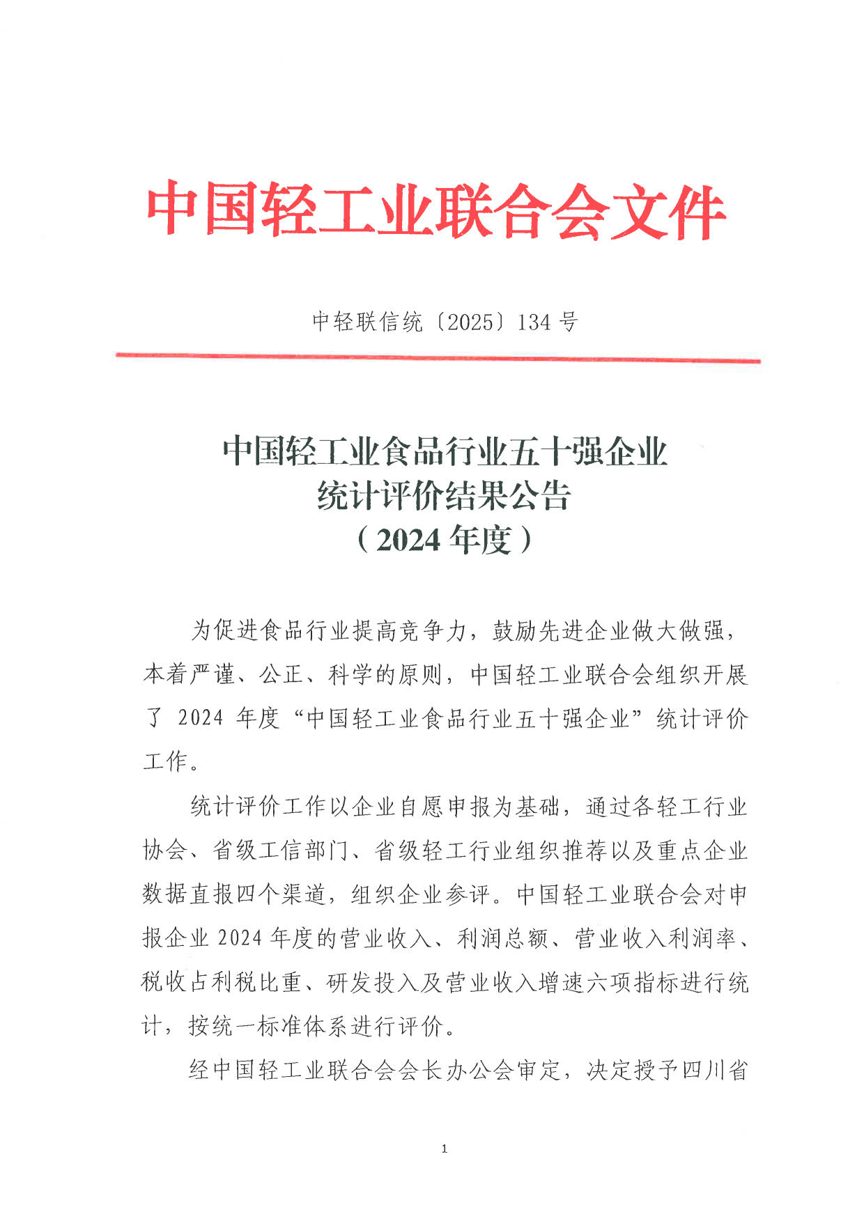 2024年度中国轻工业食品行业五十强企业评价结果公告