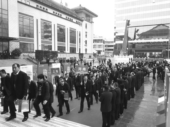 20日早上8点30分左右,在茅台会议中心的大门外,茅台高管们仍像往常一样,夹道欢迎着长长的茅台经销商们队伍步入会场。
