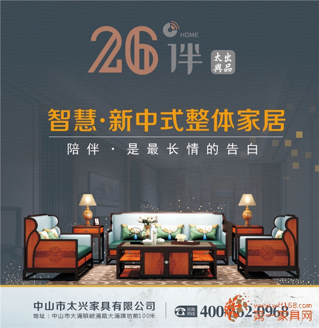 2017年为了顺应市场需求推出全新品牌“26度伴”。中山市太兴家具有限公司秉承中式硬木家具文化的内核,立足红木家具文化,深化“红木家居,全屋定制”服务体系,对产品进行创新设计,重新演绎对于中国传统家具文化的解读,打造“智慧·新中式整体家居”,满足消费者更加多元化、更加个性化的选择!