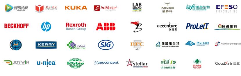 康师傅、可口可乐、玛氏巧克力中国、百味来、亿滋中国、达能、ABB、腾讯、蒙牛乳业、内蒙古伊利实业集团、好时、百事、统一集团、a2牛奶公司、精硕科技、荷兰皇家菲仕兰坎皮纳公司、Innocent饮料、箭牌、汇源三得利、光明乳业股份有限公司、广州光明乳业、星巴克、瑞士莲、雀巢、美赞臣、中粮集团、农夫山泉、SOSV、北京三元食品、诺好事中国、卡乐比、尼尔森、亿滋国际、上海来伊份股份有限公司、维他奶、格力高、百威英博、旺旺集团、百加得、谱赛科、唯他可可、麦当劳、Ideas 2 Launch LimitedDMK、合生元生物制品有限公司、爱氏晨曦、杜邦、埃森哲、德国倍福自动化有限公司、利乐、博世力士乐、库卡机器人(上海)有限公司、Stratasys、联合利华、DHL、凯度消费者指数、陶氏化学、宏盟媒体集团、罗宾逊全球物流、通用磨坊、麦肯光明广告有限公司、博达大桥广告公司、科佩集团、PaperFoam、惠普、意联科技、Dotter Creative Group OyThe Robin Collective、朗标、百胜、养生堂、现代牧业、面包新语、恒天然集团、雅培、大连雨田环保科技有限公司、埃非索管理咨询(上海)有限公司、帕斯嘉中国、微娃营养、帝亚吉欧、如新、品赞设计、养乐多、益海嘉里、宝洁、博利德、日清食品、若饭、上海英联食品、惠氏婴儿营养中国、中土畜公司、阿果安娜、绝味食品、波尔亚太有限公司、美国国际香精香料公司、禹王实业、泸州老窖电子商务、无限极、罗盖特、泰莱食品配料、胜达集团等。
