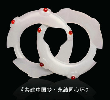 他创作的玉雕《共建中国梦,永结同心环》,作品为一块隐晶质石英玉,镶有玛瑙,可开可合,其内有二十四个截面,代表了二十四个节气和一年三百六十五天;外镶有十二颗玛瑙,代表了中国十二亿人民同心向上,共建中国的美好梦想。此作品既继承了宫廷传统工艺,又有雕刻者自身的创新,它响应了十八大中国梦的号召,是一件传统与现代完美结合的作品。此作品荣获2014年中国工艺美术精品博览会金奖和第九届百花玉缘杯中国玉石雕精品铜奖。