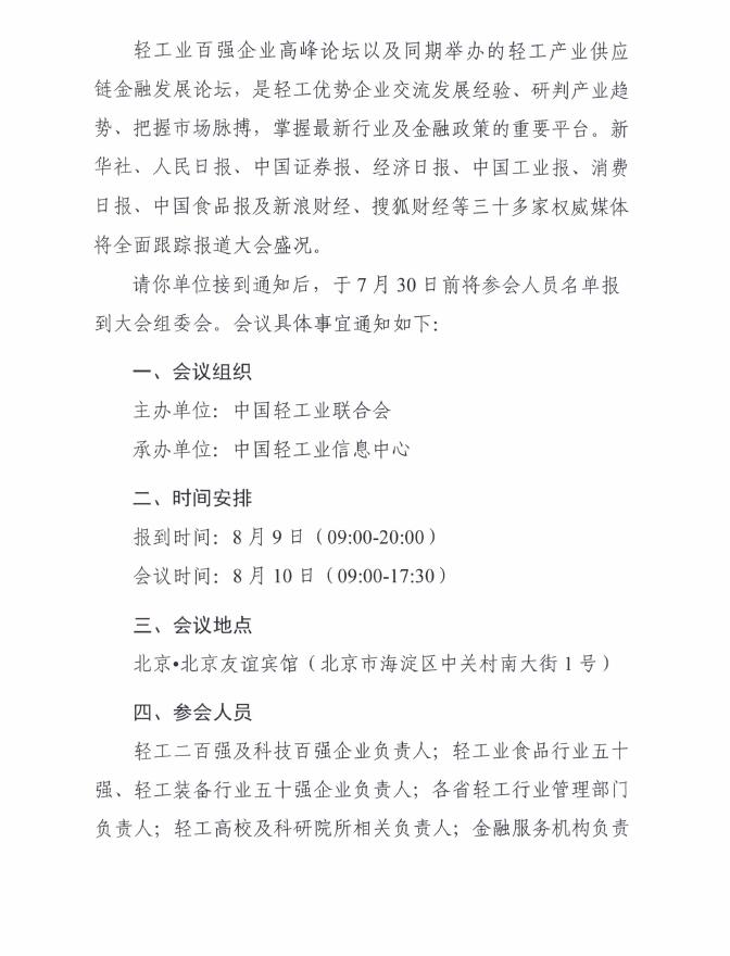 关于举办“贯彻新时代战略 建设轻工业强国”轻工业百强企业高峰论坛的通知
