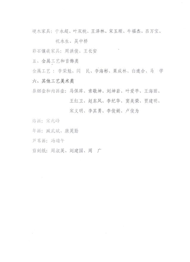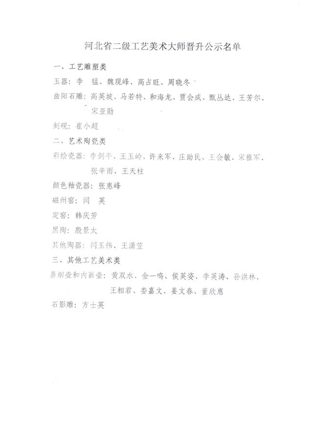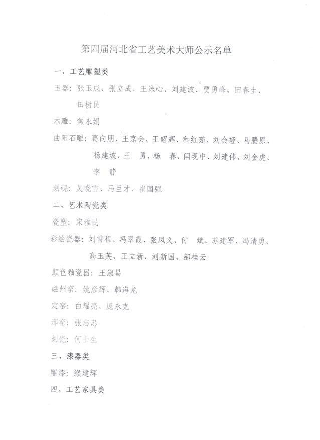 本届河北省工艺美术大师预选名单共计80人,其中工艺雕塑类24人、艺术陶瓷类18人、漆器类1人、工艺家具类10人、金属工艺和首饰类6人、其他工艺美术类21人。(公示名单附后)