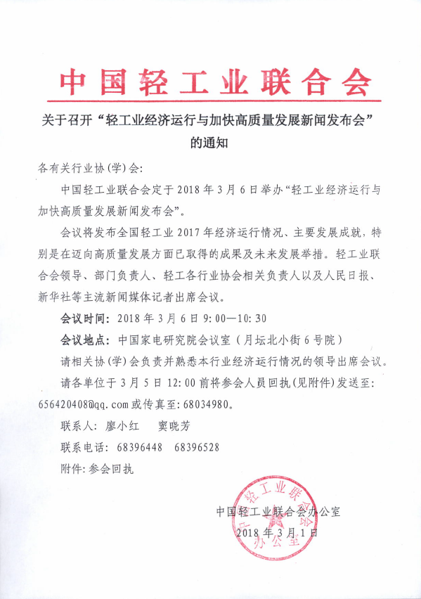 | 1、 | 关于召开“轻工业经济运行与加快高质量发展新闻发布会” 的通知 |