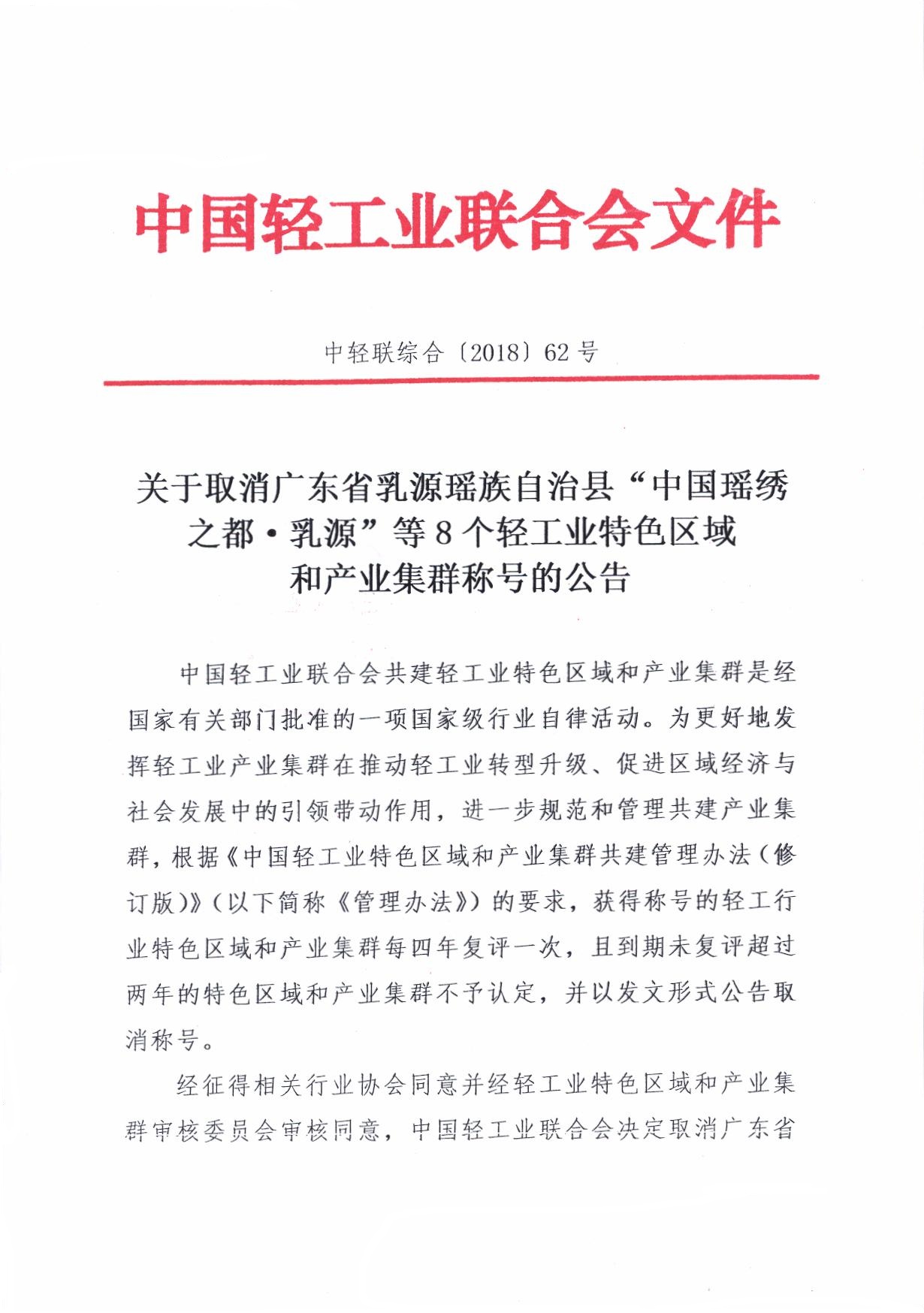 2018年3月27日, 发布公告,取消广东省乳源瑶族自治县“中国瑶绣之都•乳源”等8个轻工业特色区域和产业集群称号。原文如下:
