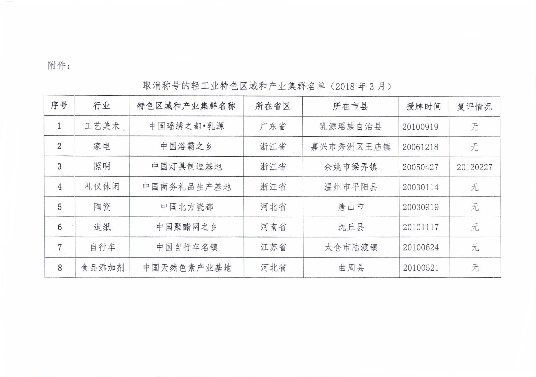 附件:取消称号的轻工业特色区域和产业集群名单(2018年3月)