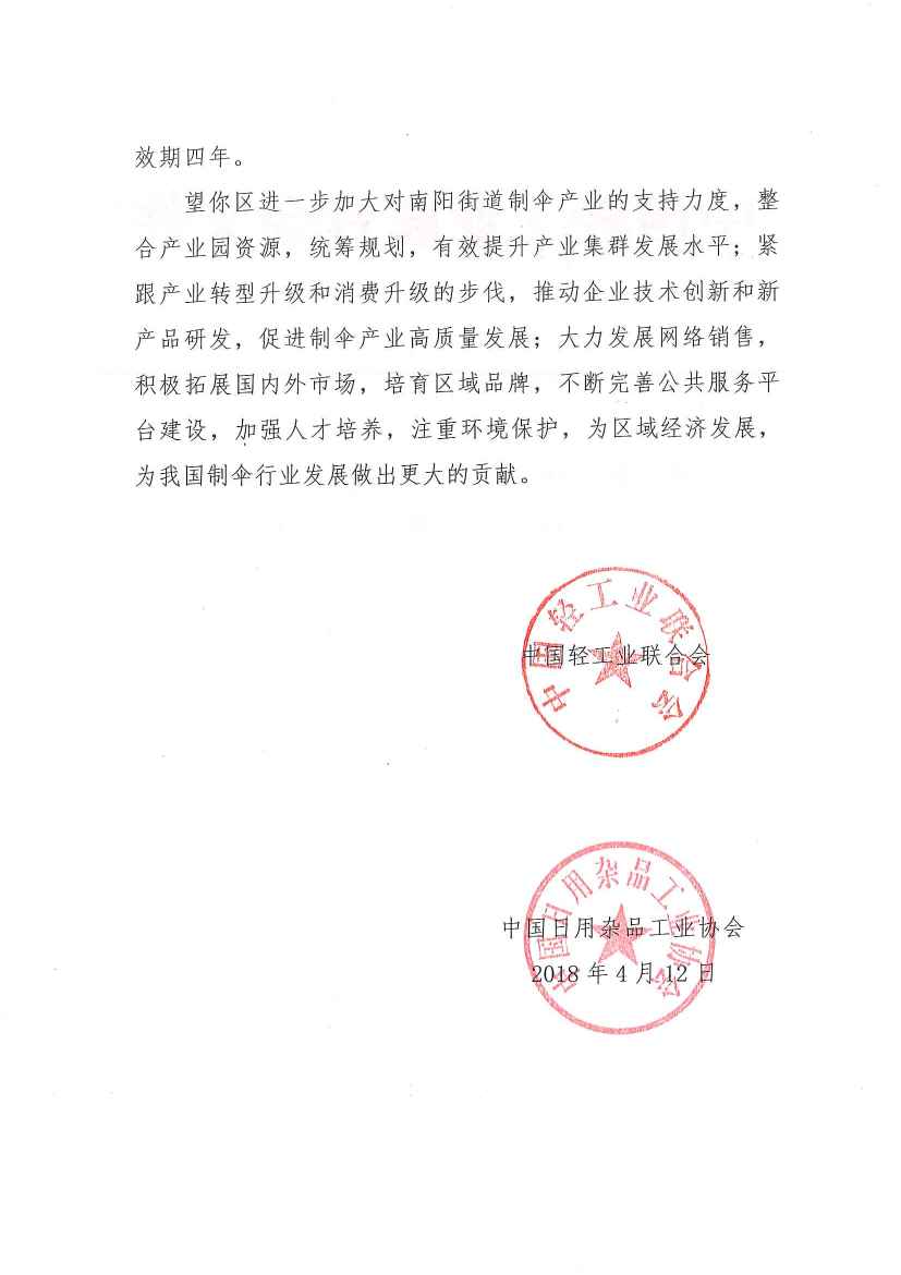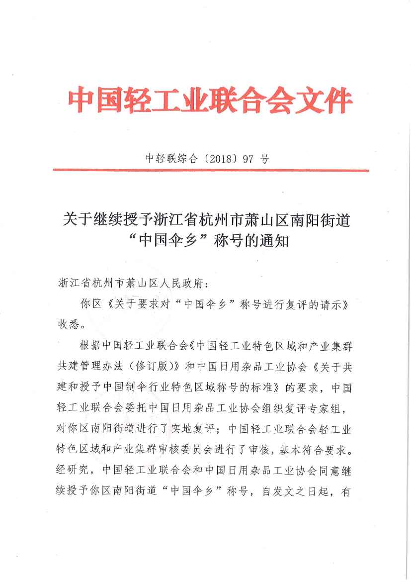 继续授予浙江杭州萧山区南阳街道“中国伞乡”称号