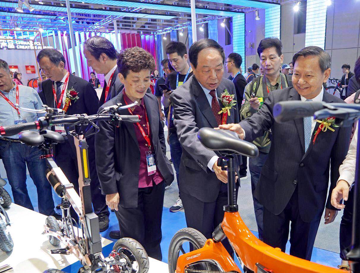 张崇和首先来到2018创新奖评选作品展台。作为行业发展的年度风向标,这里既有自行车整车、电动自行车,也有自行车飞轮等零部件,还有户外骑行用具等配饰。张崇和不时停下脚步仔细观看,认真听取工作人员讲解,还用单手提起一辆碳纤维材料自行车亲自体验轻量化设计,并仔细询问自行车破风能力。当得知该展台产品是因为设计、功能、材料、市场、创新等五大方面因素而获奖时,张崇和表示,这些产品真实展现了我国自行车行业在产品设计、制造工艺、应用材料等领域的创新能力和研发转化力,以高端化、智能化助力行业自主品牌扩大了影响力,提升了竞争力。协会要积极践行“三品”战略,加强新产品的年度统计工作,引导行业不断推出新产品、好产品。