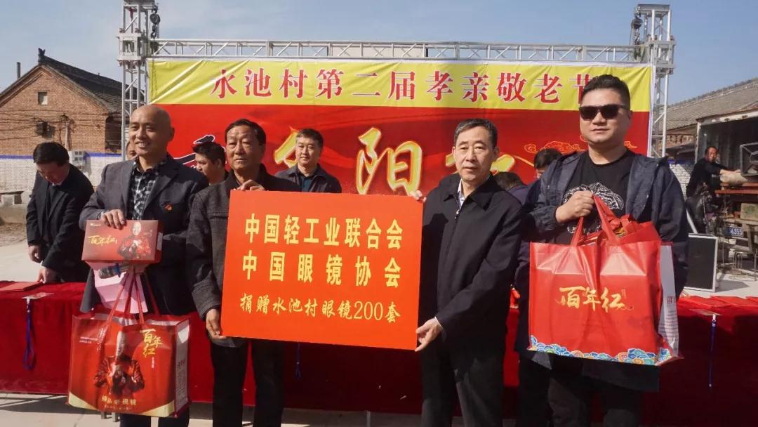 10月13日上午,在重阳节即将到来之际,杜同和理事长和戴维平秘书长率眼镜企业来到山西长治市壶关县水池村开展扶贫济困公益活动,并参与了水池村2018年重阳节活动捐赠表彰仪式。中国财贸轻纺烟草工会副主席王双清,长治市人大常委会副主任、市总工会主席崔建泰,壶关县人大常委会主任任卫明、副主任魏海玲、壶关县总工会主席王国林及水池村400余名村民齐聚一堂,眼镜行业企业志愿队为村里学生、村民免费验光配镜,向全村老人捐赠衣物和老花镜,现场气氛其乐融融。