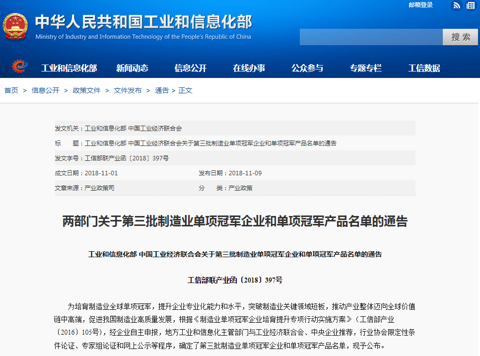 2018年11月1日,工业和信息化部、中国工业经济联合会联合发布了《关于第三批制造业单项冠军企业和单项冠军产品名单的通告》(工信部联产业函〔2018〕397号),其中,单项冠军示范企业68家,单项冠军培育企业26家,单项冠军产品66种。