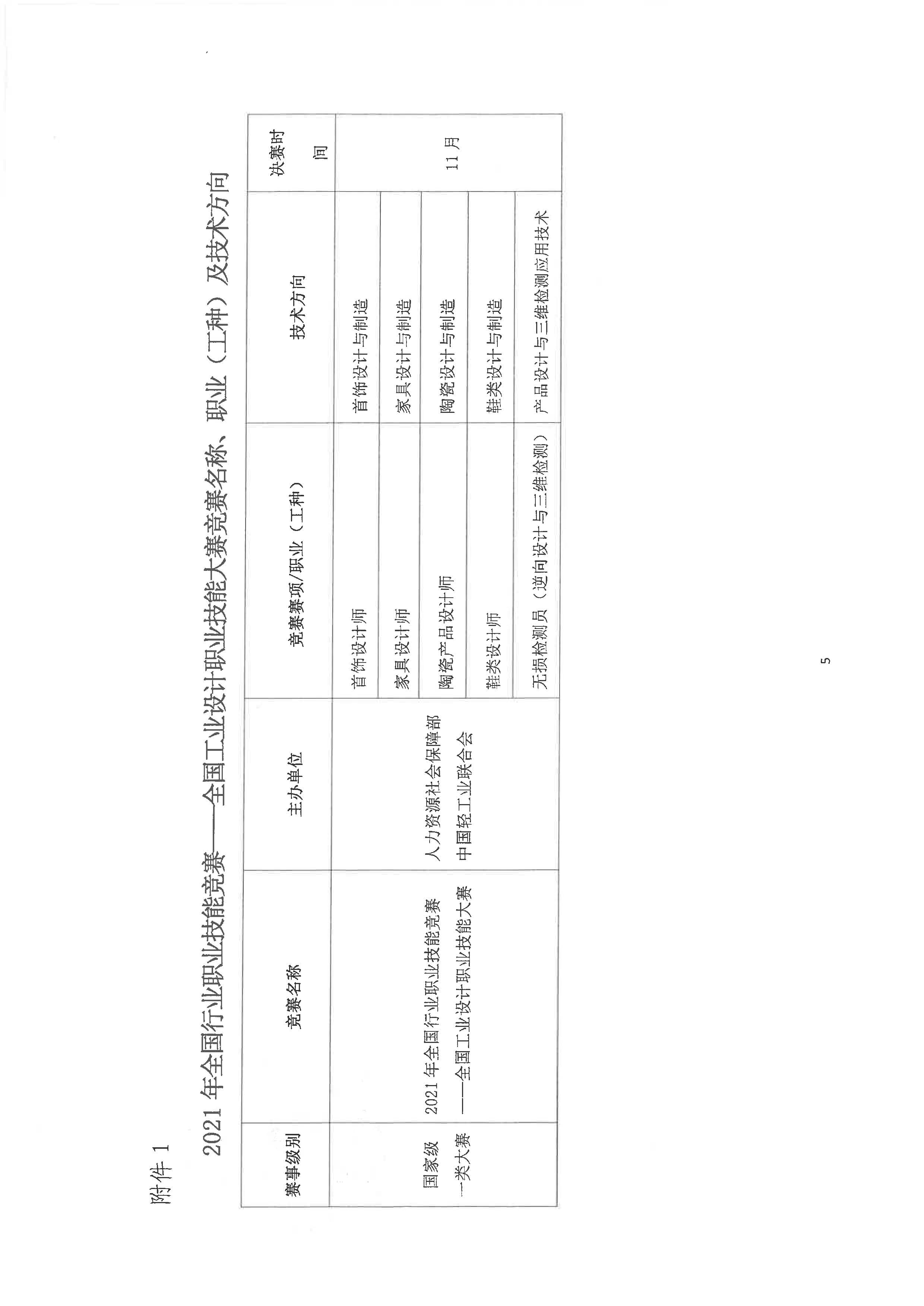 | 1、 | 2021年全国行业职业技能竞赛——全国工业设计职业技能大赛竞赛名称、职业(工种)及技术方向 |