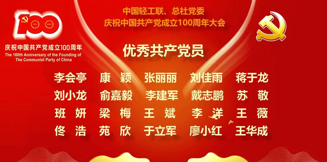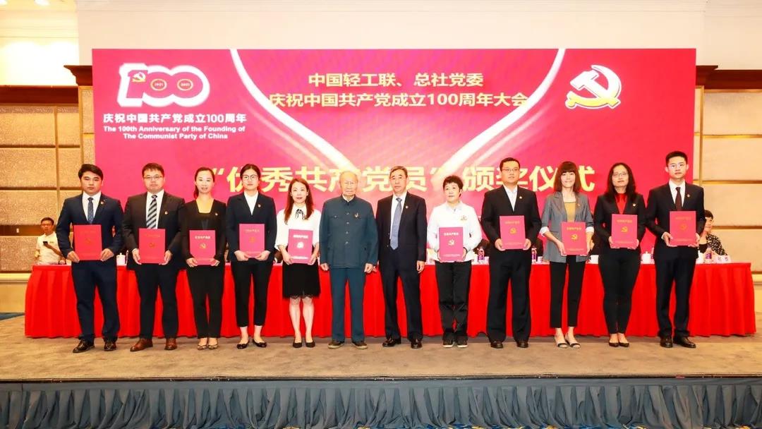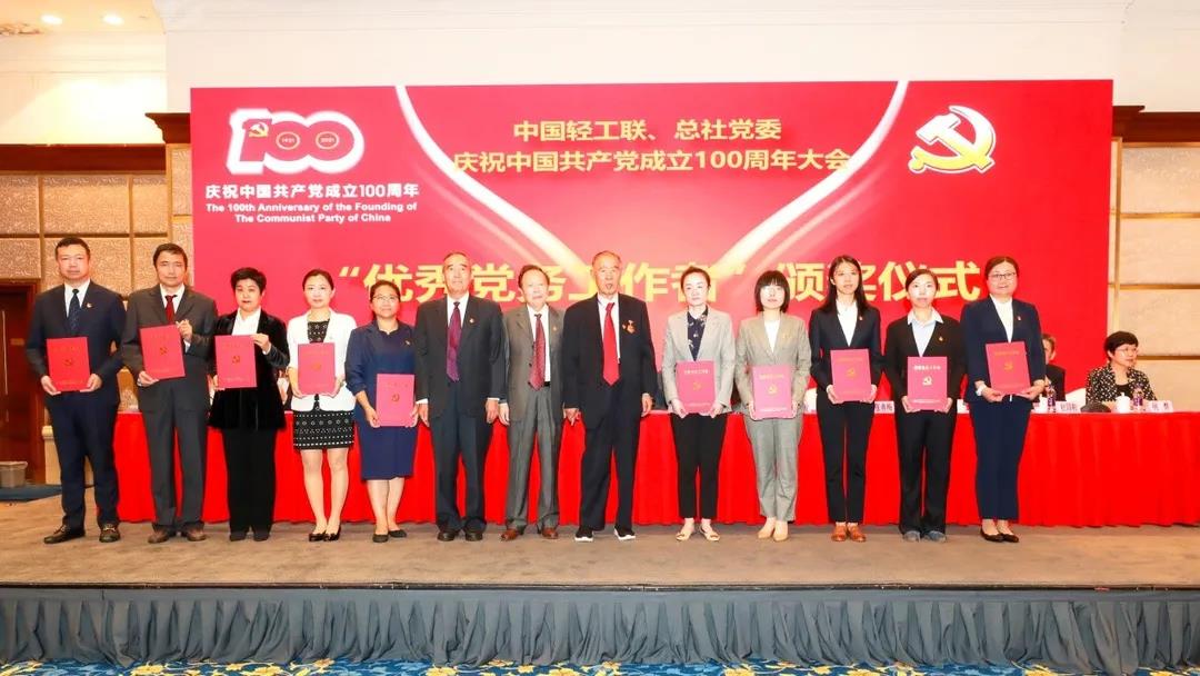 在全国上下喜迎建党百年的历史时刻,在全党深入开展党史学习教育的重要节点,6月29日,中国轻工联、总社党委在京召开庆祝中国共产党成立100周年大会,重温党的历史,总结“两化”经验,表彰先进典型,为“光荣在党50年”的老党员颁发纪念章,为新党员举行入党宣誓仪式。