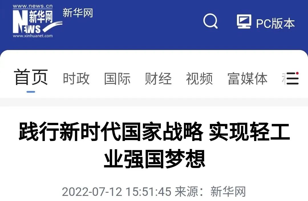7月12日,新华网重磅发布题为《践行新时代国家战略 实现轻工业强国梦想》的文章,详细阐述轻工业“868方略”,即“贯彻国家八大战略、构建六大战略体系、用好八大推进举措”,文章在行业内引发强烈反响。