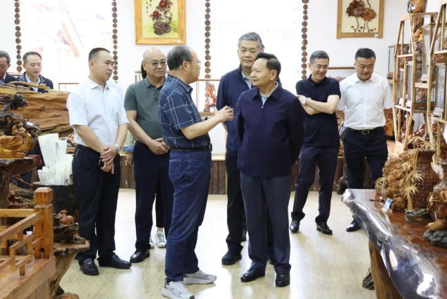 会谈前,张崇和会长一行参观了美江木艺展览馆。了解企业生产和出口情况,观看作品现场制作。张崇和鼓励负责人借中国工艺美术大师工作会议之机,与工艺美术大师深入交流,互学互鉴,提高技艺,创新发展。