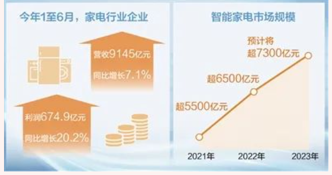 数据显示,今年1至6月,家电行业企业实现营收9145亿元,同比增长7.1%;实现利润674.9亿元,同比增长20.2%。