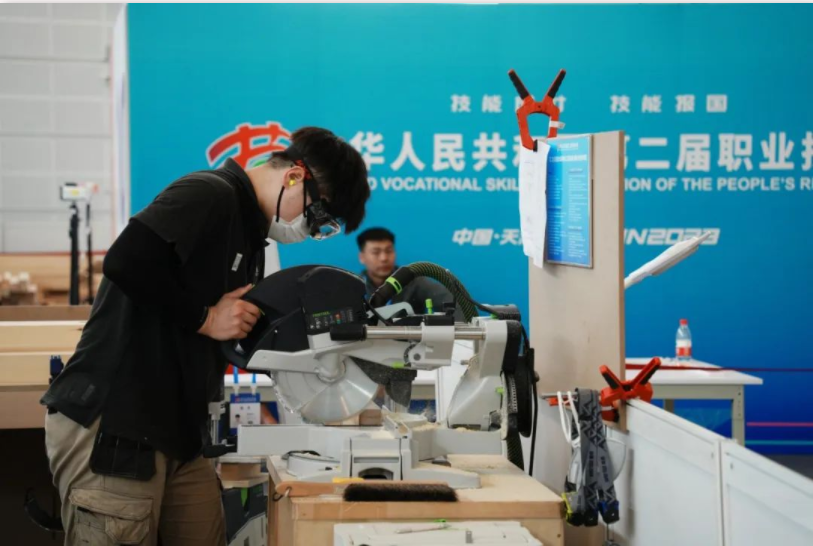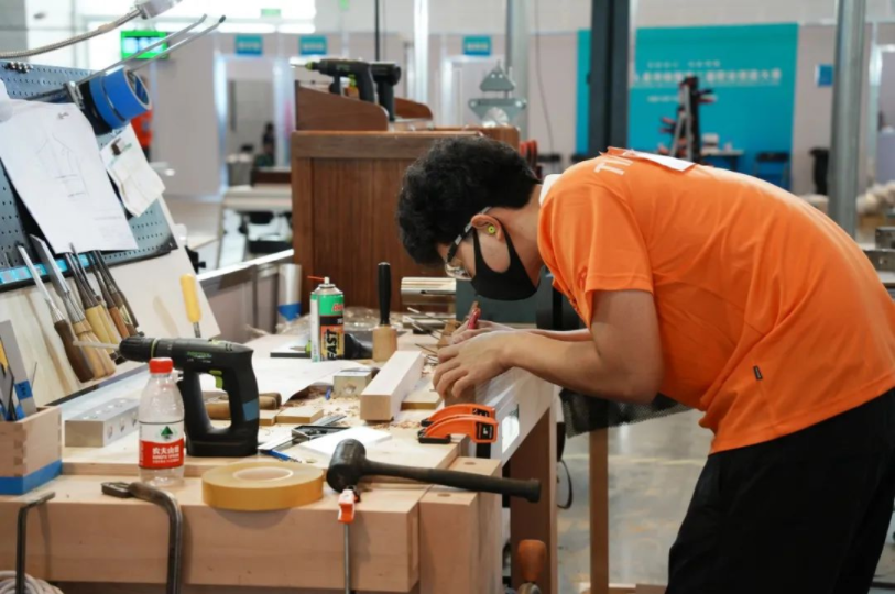 图为轻工代表队选手赵叙含参加木工项目世赛选拔。该赛项比拼选手使用精密工具切割、确保修整和造型细节的精准性,完成粗精加工并确保工作测量、剪切的准确性等能力。