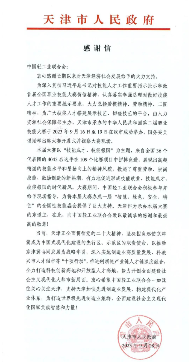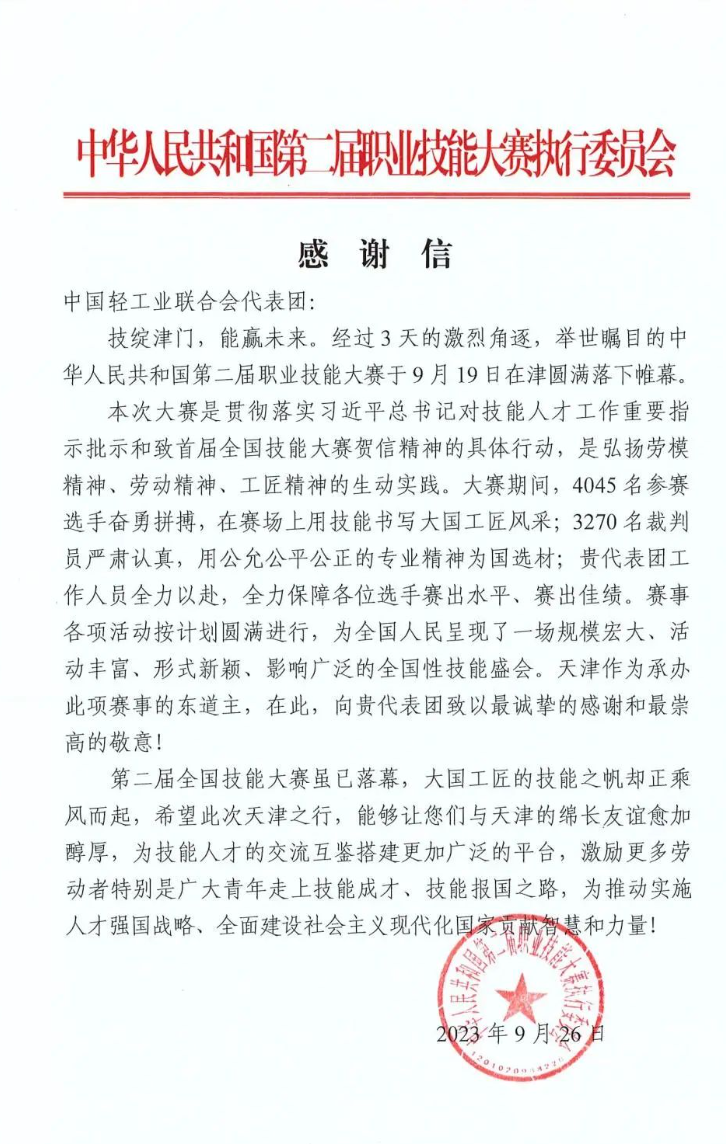 中华人民共和国第二届职业技能大赛于9月19日在天津落下帷幕, 高度重视,精心组织参赛,轻工代表团5名选手奋勇拼搏,全部获奖,取得了1金2铜2优胜1最佳选手的优异成绩,3名选手入围世赛国家集训队。大赛期间, 积极展现轻工各类职业技能竞赛发展成就,展演糖艺西点制作、核雕、陶瓷雕塑等多项绝技绝艺,吸引了多省代表团前来交流,为本届国赛奉献了特色独具的轻工风采。近日,第二届全国技能大赛执委会和天津市人民政府分别向 发来了感谢信,感谢 对本届国赛的大力支持。