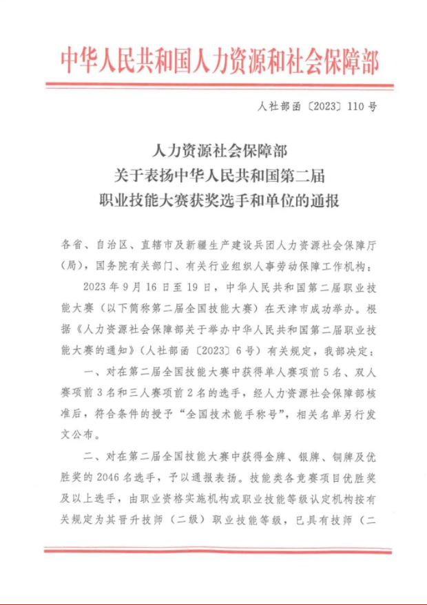近日,人力资源社会保障部印发《关于表扬中华人民共和国第二届职业技能大赛获奖选手和单位的通报》,对在第二届全国技能大赛中获得金牌、银牌、铜牌、优胜奖、最佳选手奖、突出贡献奖、优秀组织奖的选手和单位,予以通报表扬。 被授予优秀组织奖。轻工代表团赵叙含获得木工项目金牌,徐钰淇获糖艺/西点制作铜牌,侯金辰获烘焙项目铜牌,欧祖安、卢和金分别获得精细木工项目、家具制作项目优胜奖。欧祖安获得代表团最佳选手奖。按照有关规定,赵叙含、徐钰淇、侯金辰将被授予“全国技术能手”称号。