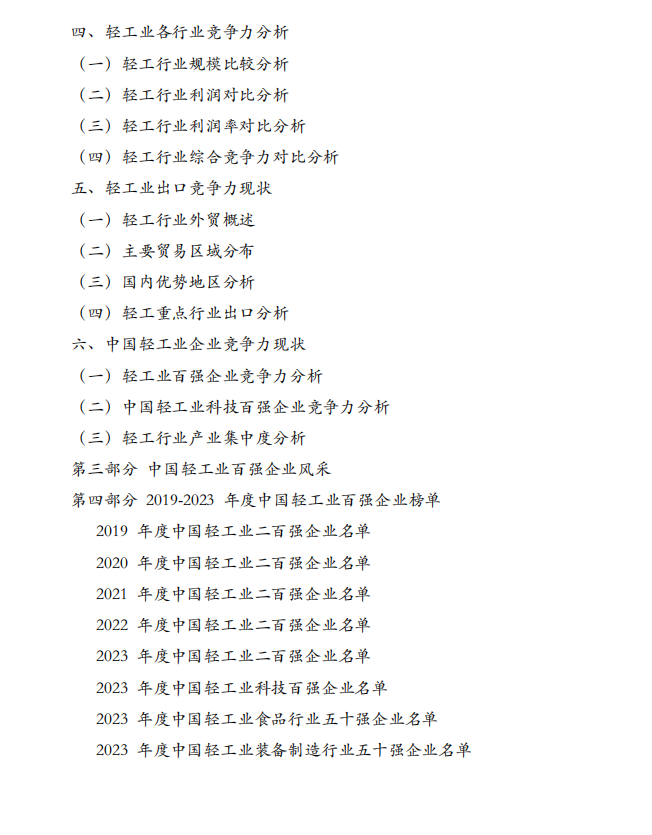中国轻工业百强企业评价工作已连续开展 13 年。轻工百强企业是建设轻工强国的领航力量。专著总结了 13 年来轻工百强企业的发展成就,展现了轻工百强企业的品牌实力,为轻工企业迈向世界一流提供了借鉴参考。希望广大轻工企业向轻工百强企业学习,以满足人民日益增长的美好生活需要为引擎,做大、做强、做优、做久,为轻工业强国建设做出更大贡献!