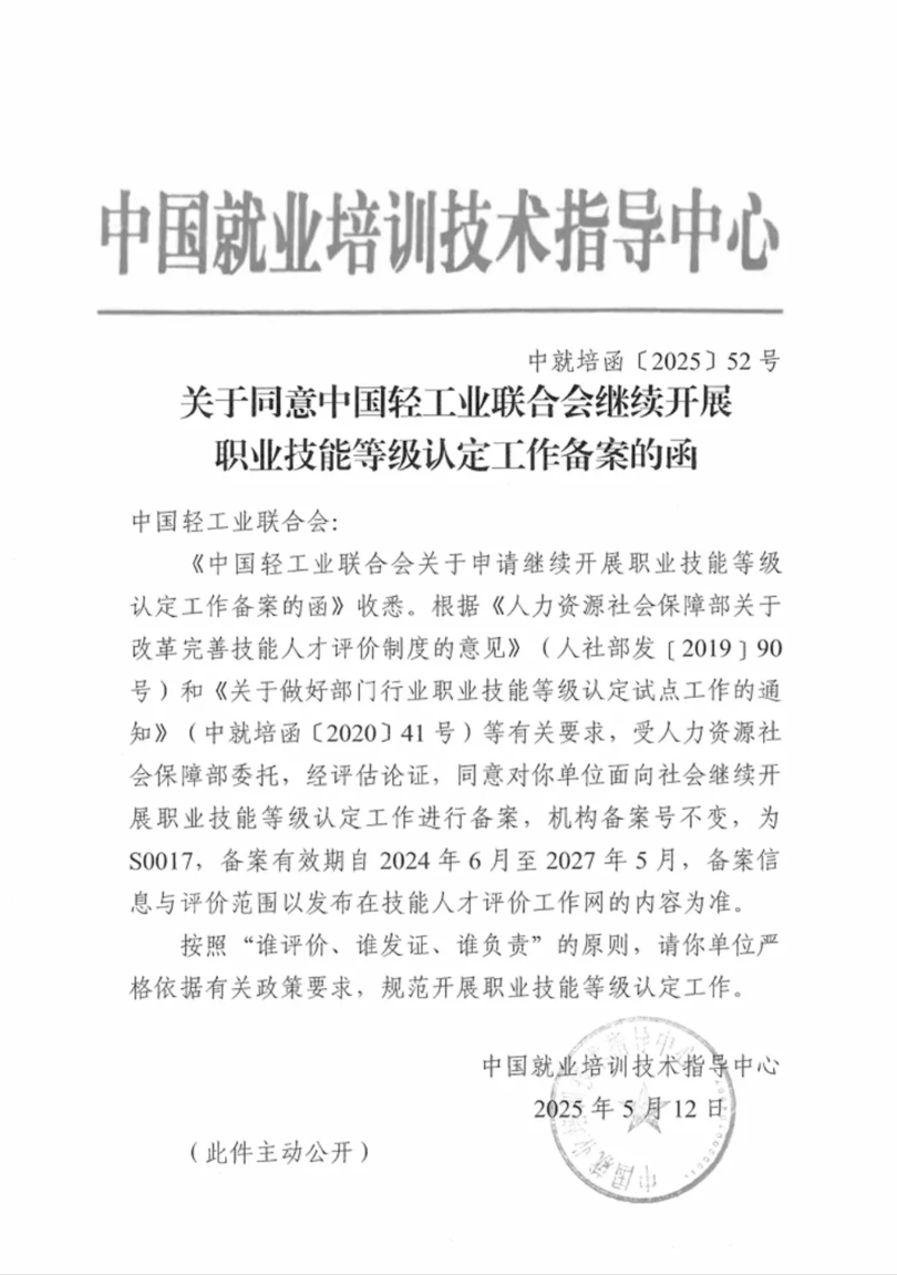 近日, (以下简称:中国轻工联)职业技能等级认定工作续期备案成功。中国轻工联将在人社部与中国就业培训技术指导中心指导下,继续面向全社会开展职业技能等级认定工作。新备案有效期至2027年5月。