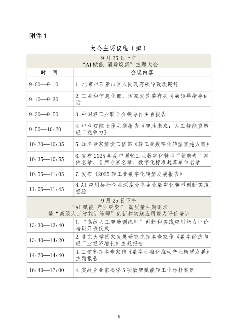 今年4月29日,习近平总书记在上海考察智能眼镜、智能儿童玩具、智能乐器等创新产品,详细了解产品功能和市场行情,亲身体验智能眼镜,对 智能化发展产生了巨大的鼓舞和动力。为全面贯彻党的二十大和二十届二中、三中全会精神,落实习近平总书记关于“促进数字技术与实体经济深度融合,赋能传统产业转型升级”“发展人工智能前景广阔,要加强政策支持和人才培养,努力开发更多安全可靠的优质产品”指示精神,加快人工智能等数字技术赋能,着力培育和发展轻工新质生产力, 定于2025年9月25日在北京市组织召开主题为“AI赋能 消费焕新”的第十五届中国轻工业信息化大会。
