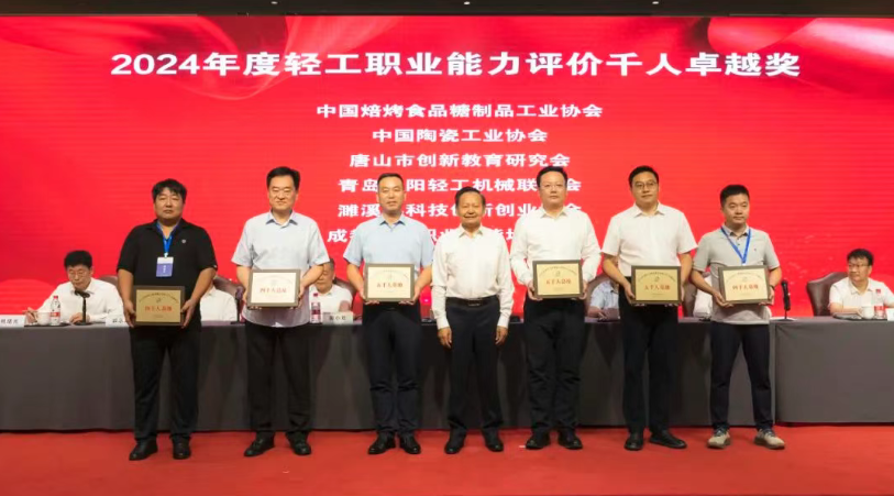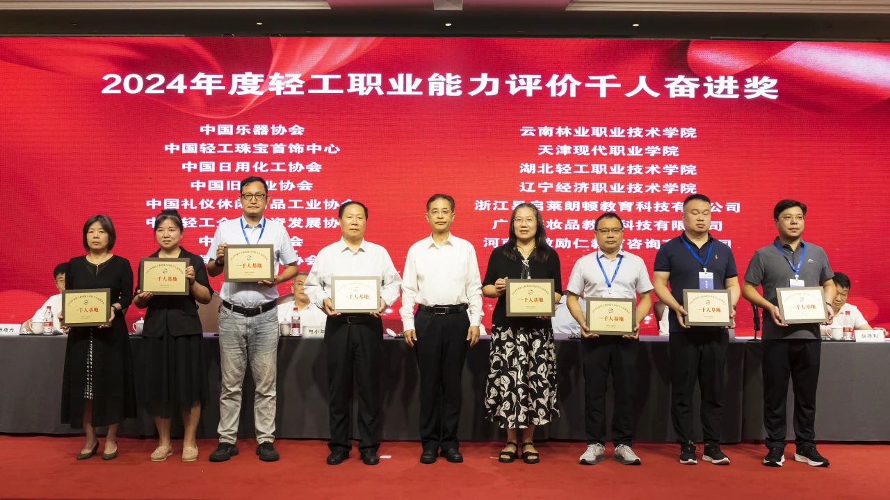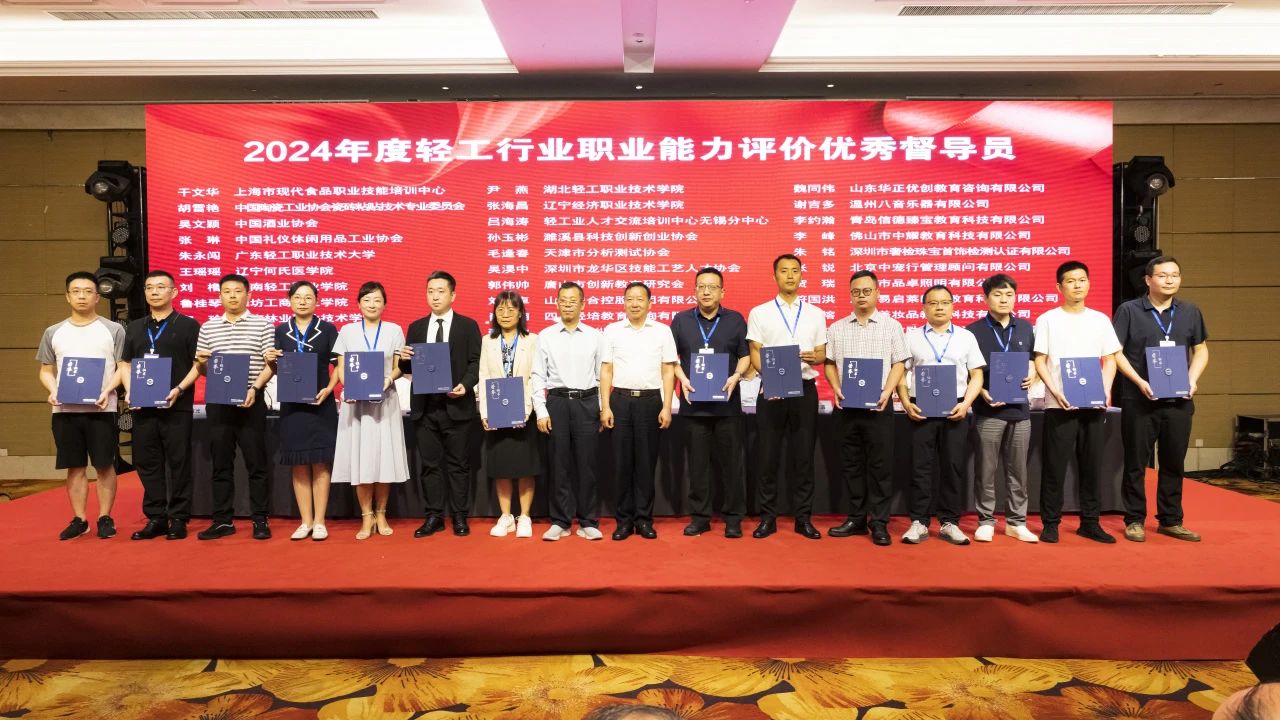 大会授予中国焙烤食品糖制品工业协会等6家单位“2024年度轻工职业能力评价千人卓越单位”称号;授予中国酒业协会等6家单位“2024年度轻工职业能力评价千人优秀单位”称号;授予中国乐器协会等15家单位“2024年度轻工职业能力评价千人奋进单位”称号;授予义乌市工艺美术行业协会等3家单位“2024年度轻工职业能力评价特色培训基地”称号;授予俞嘉毅等30人“2024年度 职业能力评价先进个人”称号;授予戎小龙等30人“2024年度 职业能力评价优秀考评员”称号;授予干文华等30人“2024年度 职业能力评价优秀督导员”称号;授予中国轻工珠宝首饰中心等13家单位“轻工业职业标准、评价规范工作优秀组织单位”称号;授予张帅等82人“全国 国家职业标准工作优秀个人”称号;授予徐力等26人“全国 评价规范工作优秀个人”称号。