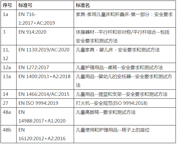执行决定(EU)2019/1698的附件一中与儿童护理用品和儿童家具相关的标准已被修订,如下表: