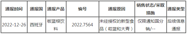 据欧盟食品饲料类快速预警系统(RASFF)消息,2022年12月26日,欧盟通报我国出口板蓝根饮料不合格。具体通报内容如下: