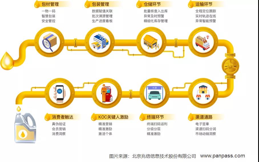 以兆信科技服务的中石油润滑油为例,每一个润滑油单品都有唯一的身份二维码,即“一物一码”,扫码可以鉴真伪、参加领红包等游戏活动,可以窜货稽查,可以溯源润滑油的流通走向,这些码又与箱码、托码关联,便于仓储和经销管理。在项目实施过程中,实现了数百条的产线自动化改造,大力推动了中石油润滑油“智慧工厂”的建设。