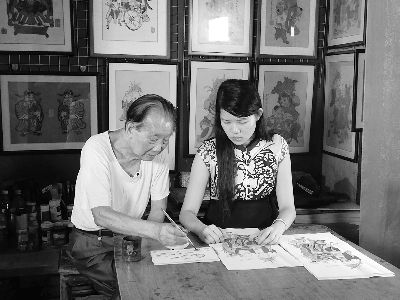 冯炳棠生前向徒弟刘钟萍传授木版年画制作技艺