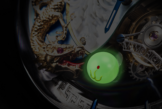 表面以天地为背景,参考中国明代末、清代初的宫廷雕刻打造的18K金立体金龙栩栩如生,从水底探出头;于中心盘旋的“火凤”以精湛的浮雕技术,勾勒出祥和神色,镶嵌于离表面半毫米的位置,呈现在空中飞翔的景象。腕表8时位置,以极精密的技术把日本阿古屋珍珠掏空,加入数条目前世界最强光的高科技氚气管,于直径只有5毫米的空间放入足足9件零件,令“内丹”在漆黑中散发光芒,再现了“龙吐珠”的传说!“内丹”以每60秒转一圈的速度转动,与置于6时位置的飞行陀飞轮相辉映。陀飞轮每小时振频达28800次,更配合72小时动力储存。内丹如轮转动,周而复始,寓意福寿无疆。