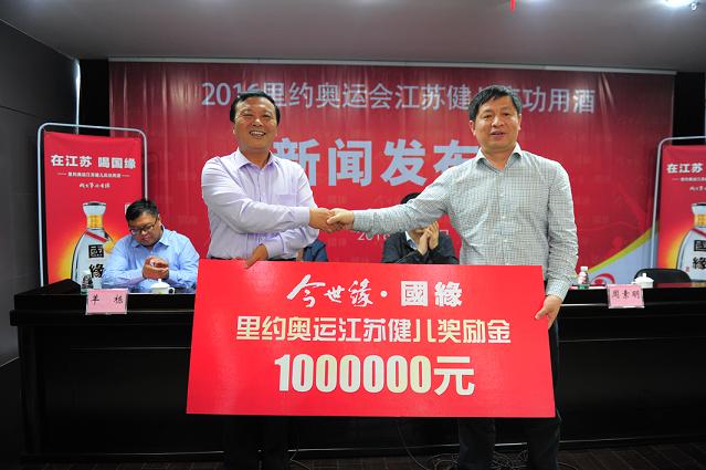 距里约奥运会还有88天之际,江苏省体育局获得今世缘酒业股份有限公司100万元捐赠款,用于奖励奋战在里约奥运赛场上的江苏健儿。其国缘系列酒也被确定为第31届里约奥运会江苏奥运健儿庆功用酒。
