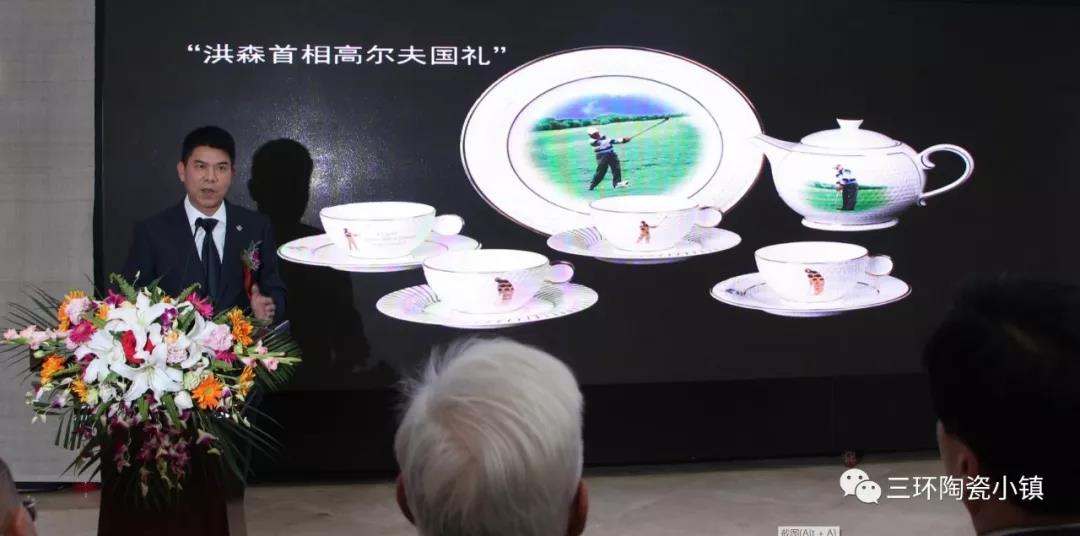 副会长兼秘书长、中国陶瓷工业协会理事长杜同和给三环集团授予中国国家用瓷生产企业牌匾,并宣布汇报展开幕。