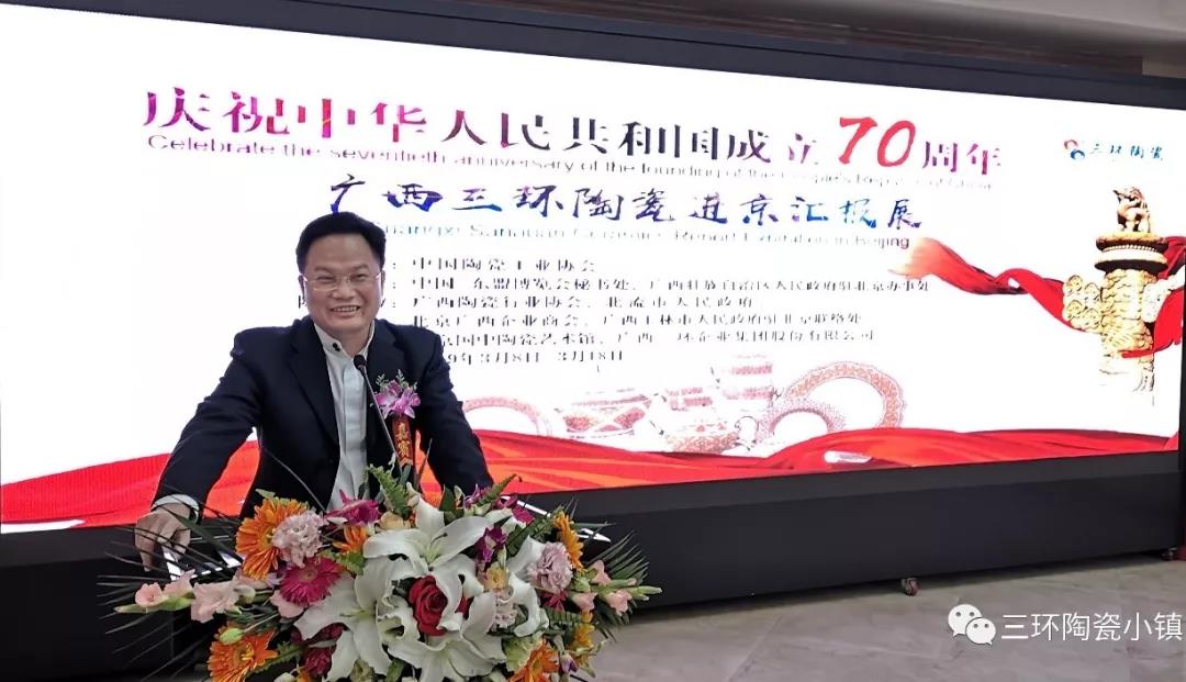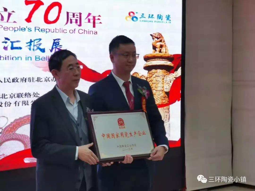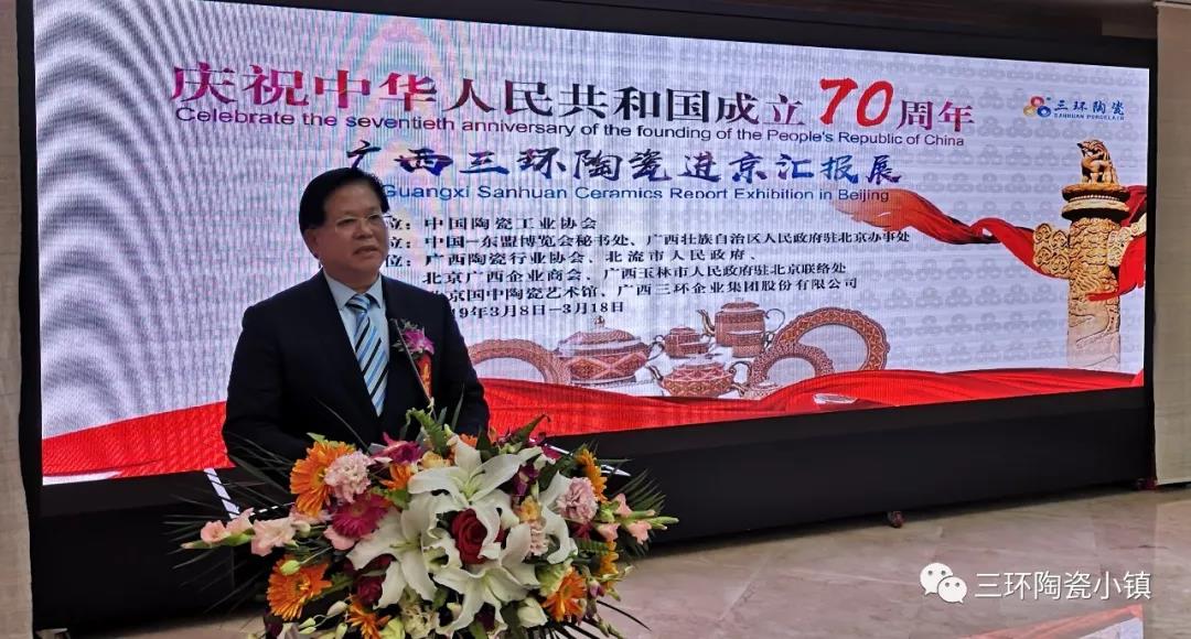 为了迎接中华人民共和国70岁生日,在中国陶瓷工业协会的主持下,在中国-东盟博览会秘书处、广西壮族自治区人民政府驻北京办事处、广西陶瓷行业协会、北流市人民政府、北京广西企业商会和广西玉林市人民政府驻北京联络处的共同支持协助下,由北京国中陶瓷艺术馆和广西三环企业集团共同策划的,【庆祝中华人民共和国成立70周年-广西三环陶瓷“中国国家用瓷生产企业”受匾仪式暨国礼进京展】于2019年3月8日至2019年3月18日在北京国中陶瓷艺术馆举行。期间,还将举行中国陶瓷工业协会为三环集团颁发“国家用瓷生产企业”授牌仪式和“高温硬质瓷技术与创新”主题的研讨会。