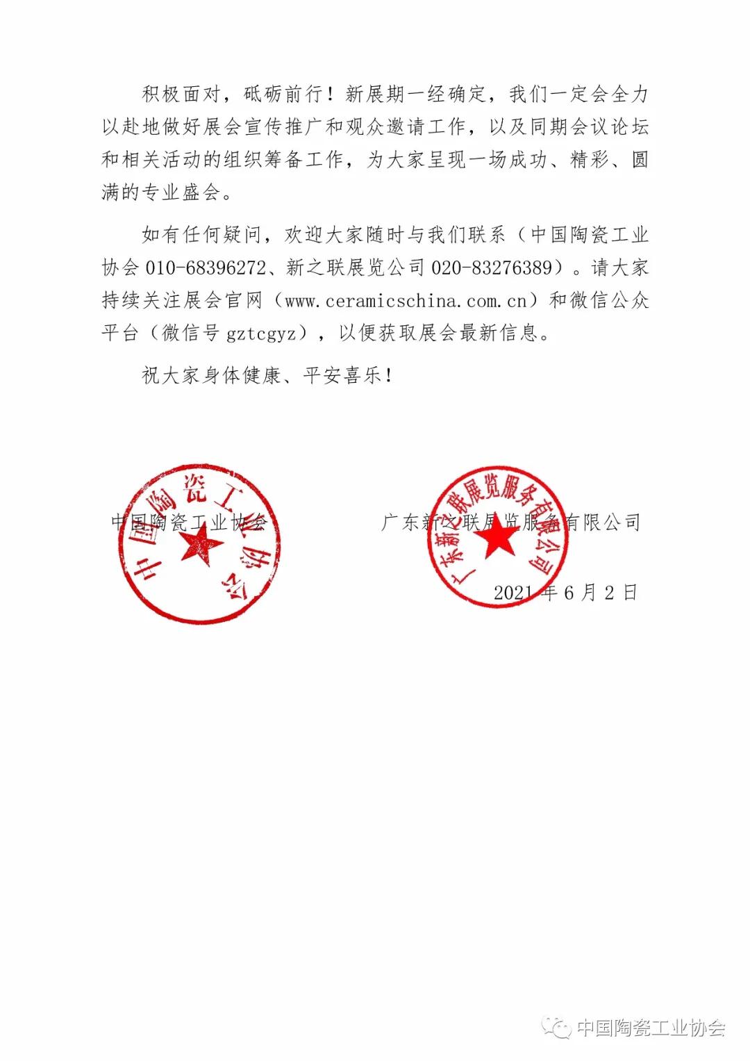 鉴于近期广州及周边地区突发本土疫情,结合广东省和广州市新冠疫情防控的有关要求,从保障参会人员健康安全的角度出发,在认真听取了参展商、采购商、各省市陶协和媒体的建议后,我们决定将原定于2021年6月22至25日在广州广交会展馆A区举办的“第35届广州陶瓷工业展”及“线上国际陶瓷工业展”延期举办(具体时间与展馆确定后将在第一时间公布),展览地点不变。