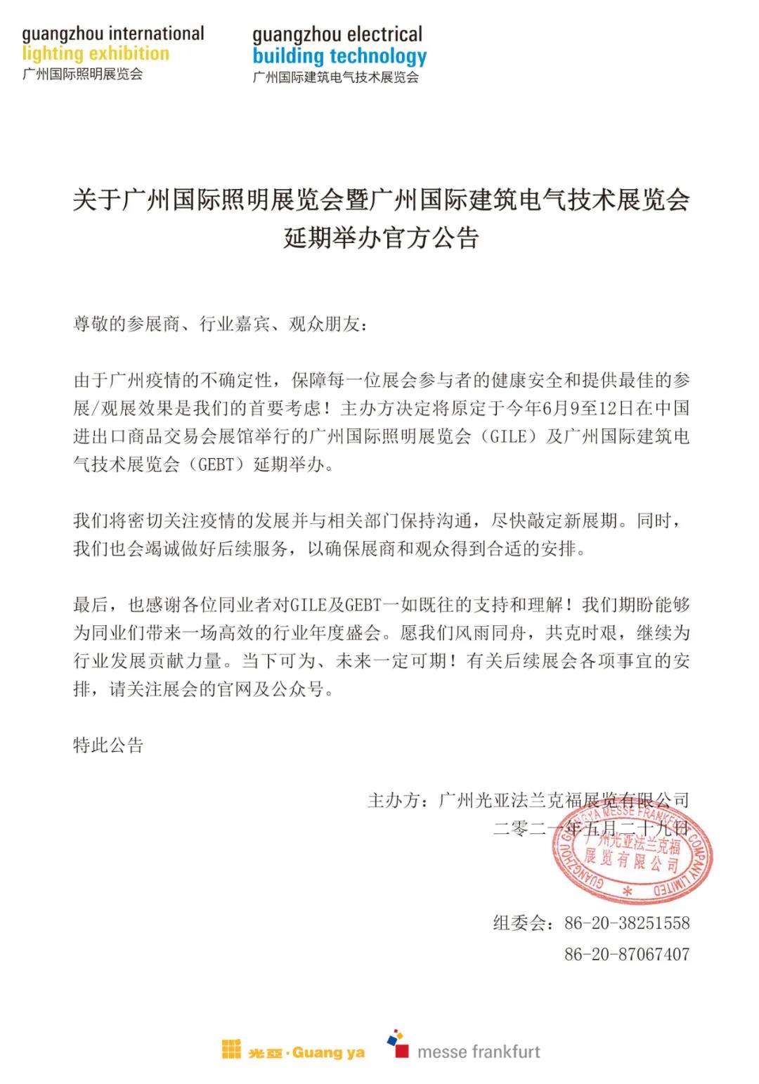 鉴于现时广州疫情的不确定性,广州光亚法兰克福展览有限公司宣布广州国际照明展览会暨广州国际建筑电气技术展览会延期举办。新展期将容后公布。官方公告详情如下: