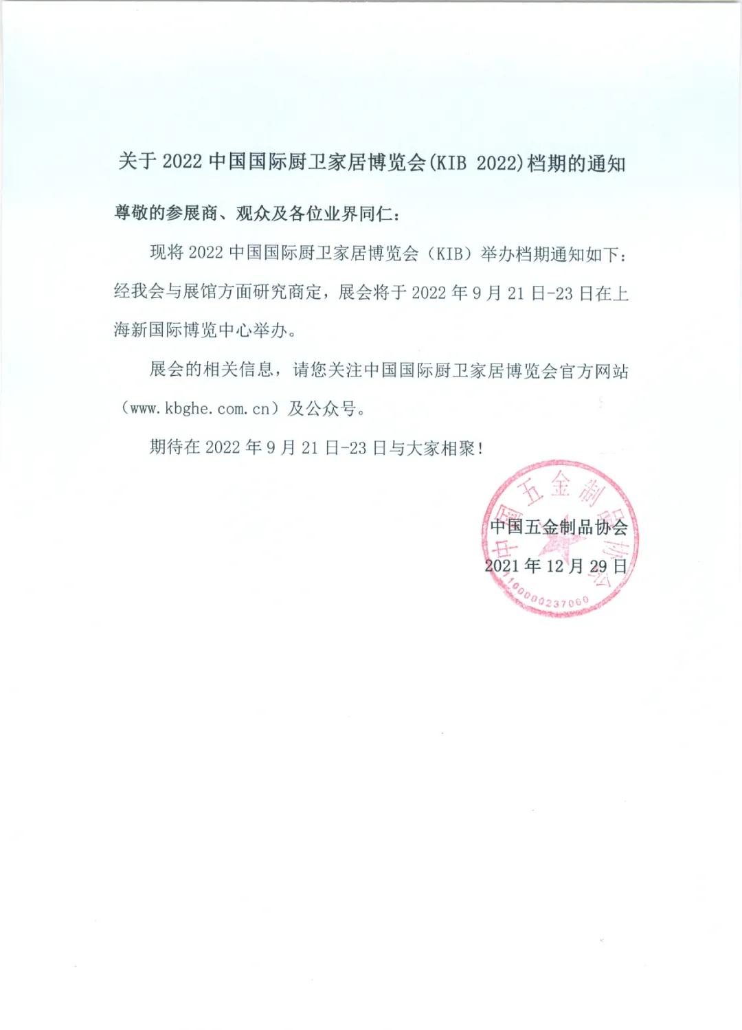 关于2022中国国际厨卫家居博览会(KIB 2022)档期的通知